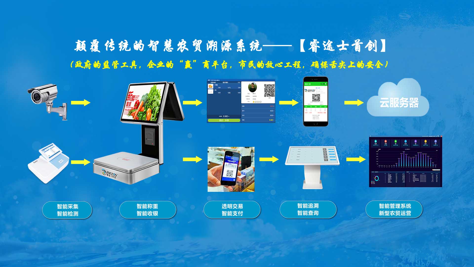 創(chuàng)新實現(xiàn)了【智慧農(nóng)貿(mào)溯源管理系統(tǒng)】與【智能稱重收銀】一體化解決方案,集市場管理、運營管理、溯源追溯、智能收銀大數(shù)據(jù)運用于一體,硬件、軟件與管理系統(tǒng)完美結合。適用于農(nóng)批、農(nóng)貿(mào)市場蔬菜、生鮮、水果、水產(chǎn)、肉類、熟食等稱重和非稱重銷售;由于采用一體化設計,解決了傳統(tǒng)農(nóng)貿(mào)市場無法實現(xiàn)的信息化、智能化、可追溯的管理問題;使稱重、收銀、追溯、管理、更透明、公正、安全,讓顧客無后顧之憂,給管理工作帶來極大的便捷與高效,對國內(nèi)農(nóng)產(chǎn)品行業(yè)的發(fā)展、農(nóng)產(chǎn)品流通管理起到了典范作用。 【睿途士首創(chuàng)】顛覆傳統(tǒng)的“智慧農(nóng)貿(mào)市場系統(tǒng)”,解決了傳統(tǒng)農(nóng)貿(mào)系統(tǒng)單一安卓掛屏,昂視不方便看、不直觀、無互動性,傳輸信息不齊全、不穩(wěn)定的問題,也解決了按鍵電子秤商品難找、商品代碼難記、按鍵操作不靈活、支付不智能,對收銀管理、銷售商品、菜名、菜價、打折、優(yōu)惠、會員、線上下單、采購等無法實現(xiàn)實際菜品交易和追溯等問題。 更具顛覆性的是睿途士智慧系統(tǒng)擁有三大管理平臺(市場管理平臺、總部運營管理平臺、商戶后臺管理平臺)、一個可視操作前臺和三大追溯功能,讓遠程管理、數(shù)據(jù)傳輸、人機互動、智能控制、移動支付、大數(shù)據(jù)、互聯(lián)通信、云端存儲、人工智能、智能城市、電子定位、智能收銀等功能得以實現(xiàn)。